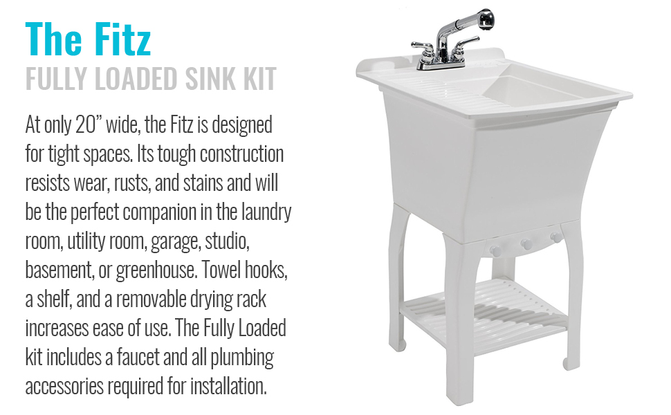 The Fitz Workstation Essential Sink Kit 11999 1990-30-01 Essential Sink Kit. With a large 20-gallon capacity the Heavy Duty Sink will easily fit into your laundry and utility rooms. Down plumbing supply lines and even drain accessories.