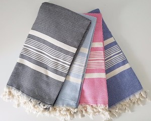 Peshtemals hand loomed in Turkey 100 Turkish Cotton. They are very light fold nicely take twice as less space than terry cloth towels absorb more and dry quicker. Most of antique civilizations had already known what cleaning means health and happiness.